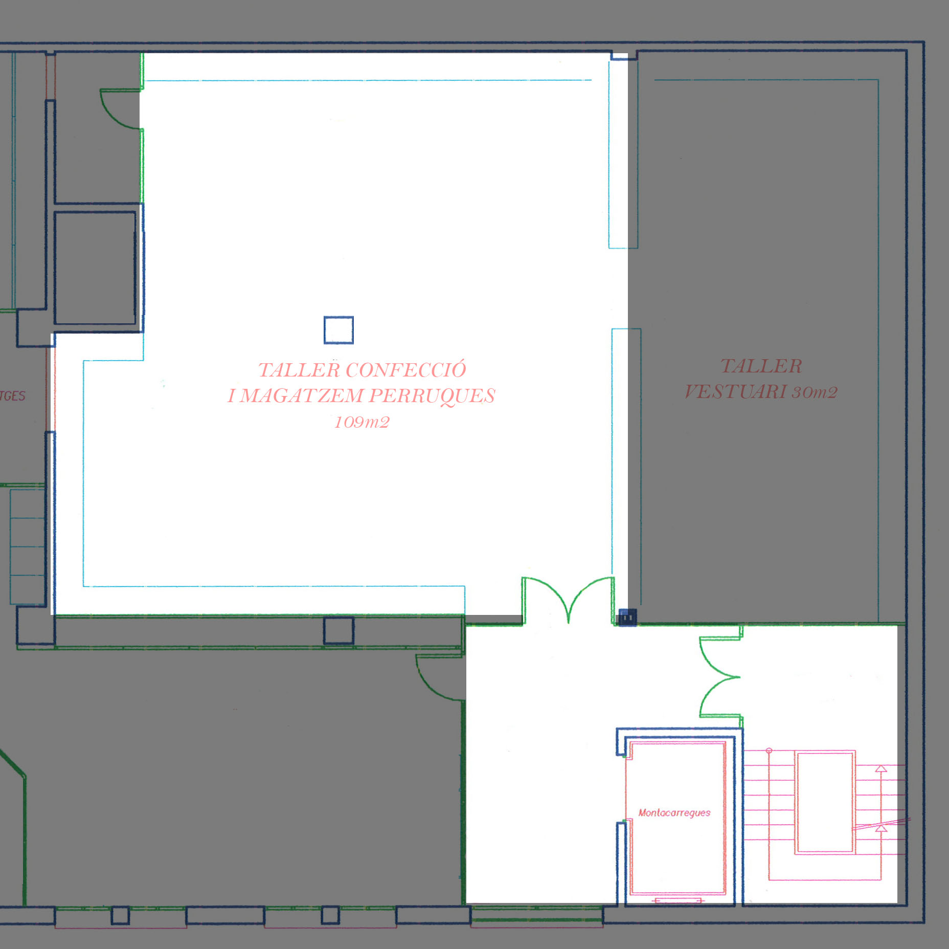 • Accés per l’escala (planta 2) + muntacàrrega mixt (500 kg pes màxim i 215cmx165cm i 200cm alçada).